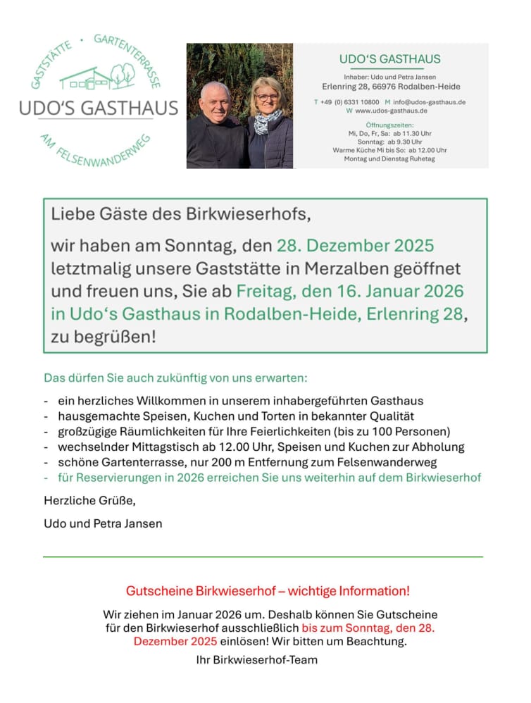 wir freuen uns, Sie ab Freitag, den 16. Januar 2026 in unserem Gasthaus in Rodalben, mitten im Herzen des Pfälzer Waldes und in direkter Anbindung an den Rodalber Felsenwanderweg, zu begrüßen.